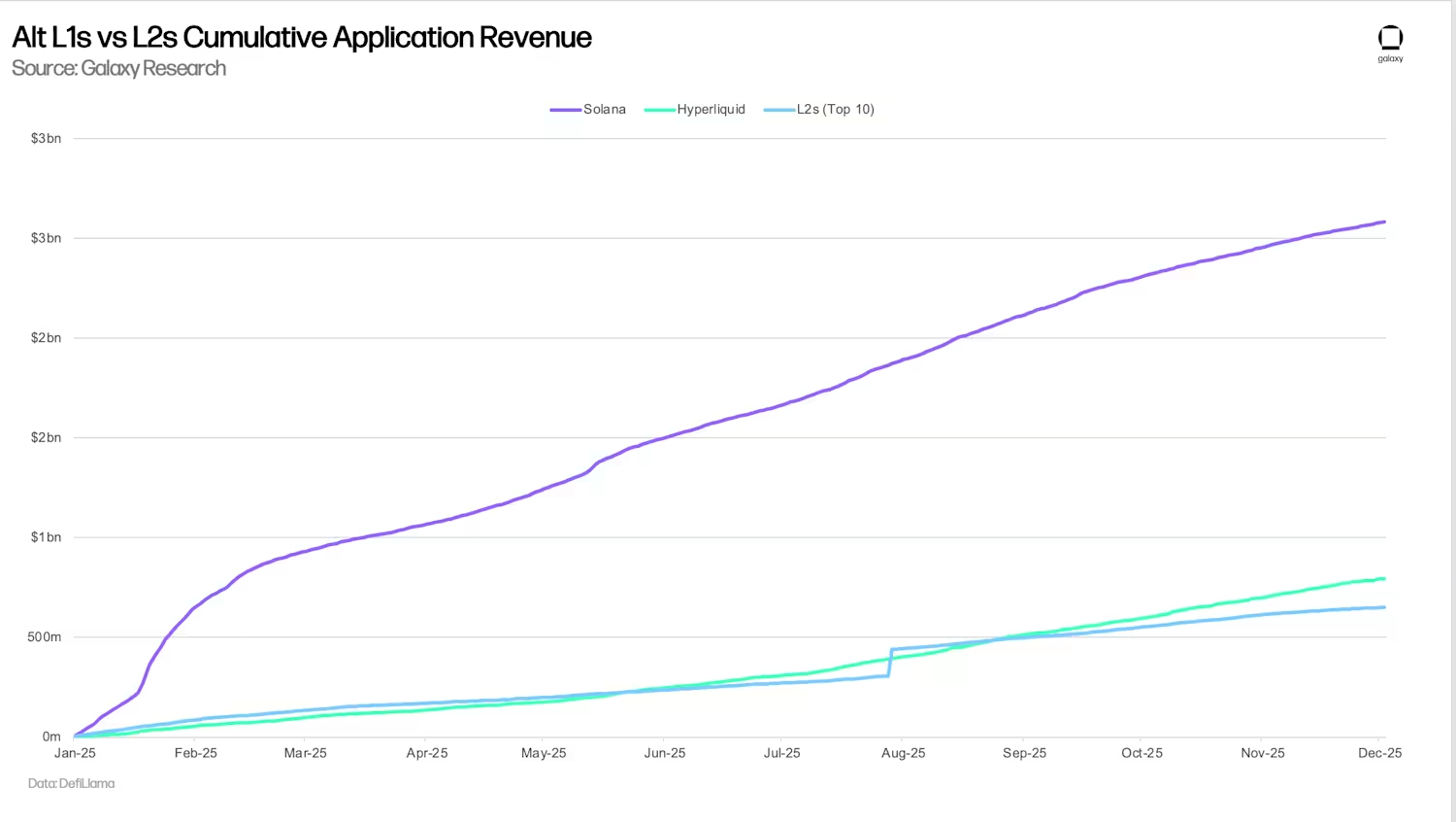 结果:这一预测未能实现。在网络和应用层面,Layer 2 整体表现逊于主要的 Alt-L1 链。Solana 巩固了其作为事实上的零售投机链的地位,持续占据了全行业中交易量和手续费收入的最大份额。同时,Hyperliquid 成为永续合约交易的主导平台,其单一平台的累计应用收入就超过了整个 Layer 2 生态系统。尽管 Base 是唯一接近 Alt-L1 级别吸引力的 Layer 2 链——2025 年占据了近 70% 的 Layer 2 应用收入——但即使是 Base 的增长也不足以超越 Solana 和 Hyperliquid 的经济重心。