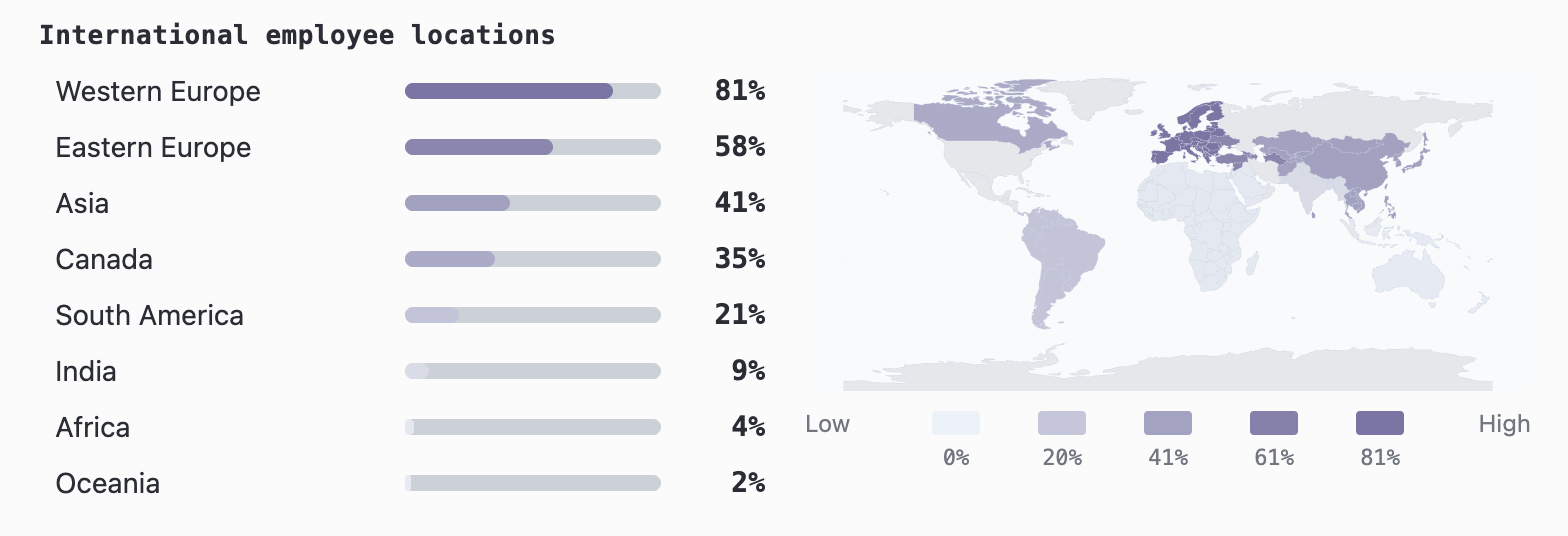 亚洲地区的布局同比几乎翻倍,从 20% 提升至 41%,以适应更强劲的用户采用与市场需求。这样看来,亚洲地区的员工数量其实并不占主流。