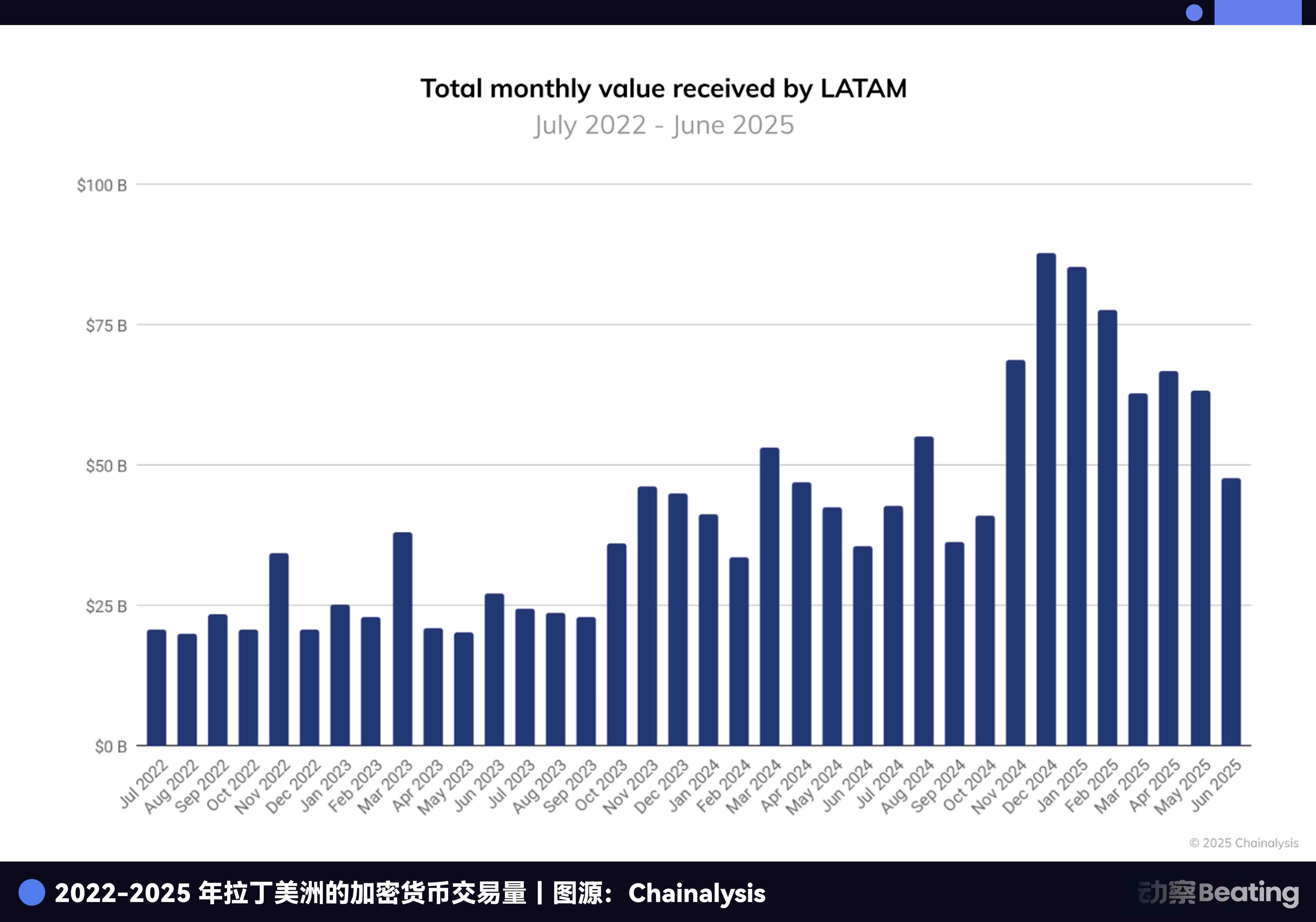 据 Chainalysis 数据显示,2022 年到 2025 年间,拉美加密货币交易量逼近 1.5 万亿美元,在巴西,超过九成的交易都与稳定币有关。