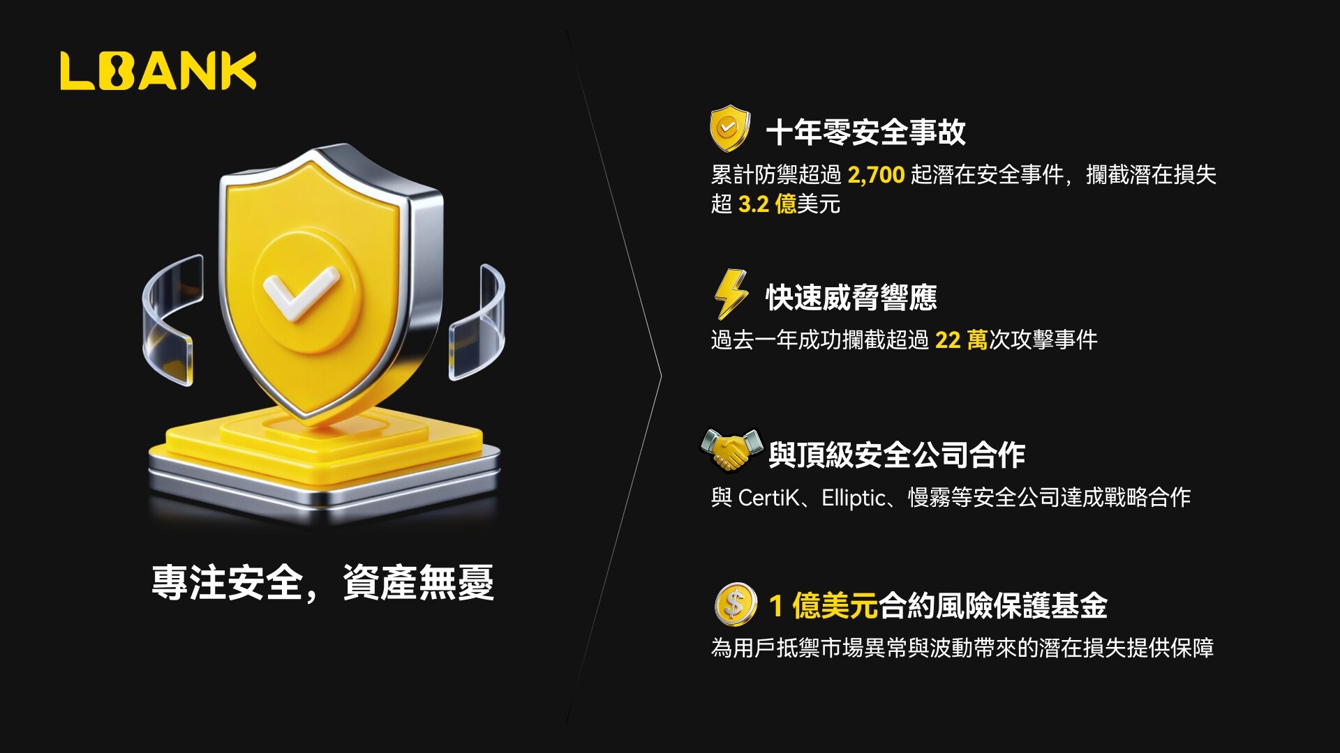 通过与 CertiK、Elliptic、慢雾等顶级安全机构的深度合作,以及 1 亿美元合约风险保护基金 的制度化兜底,LBank 将安全承诺转化为可验证、可执行的长期机制。