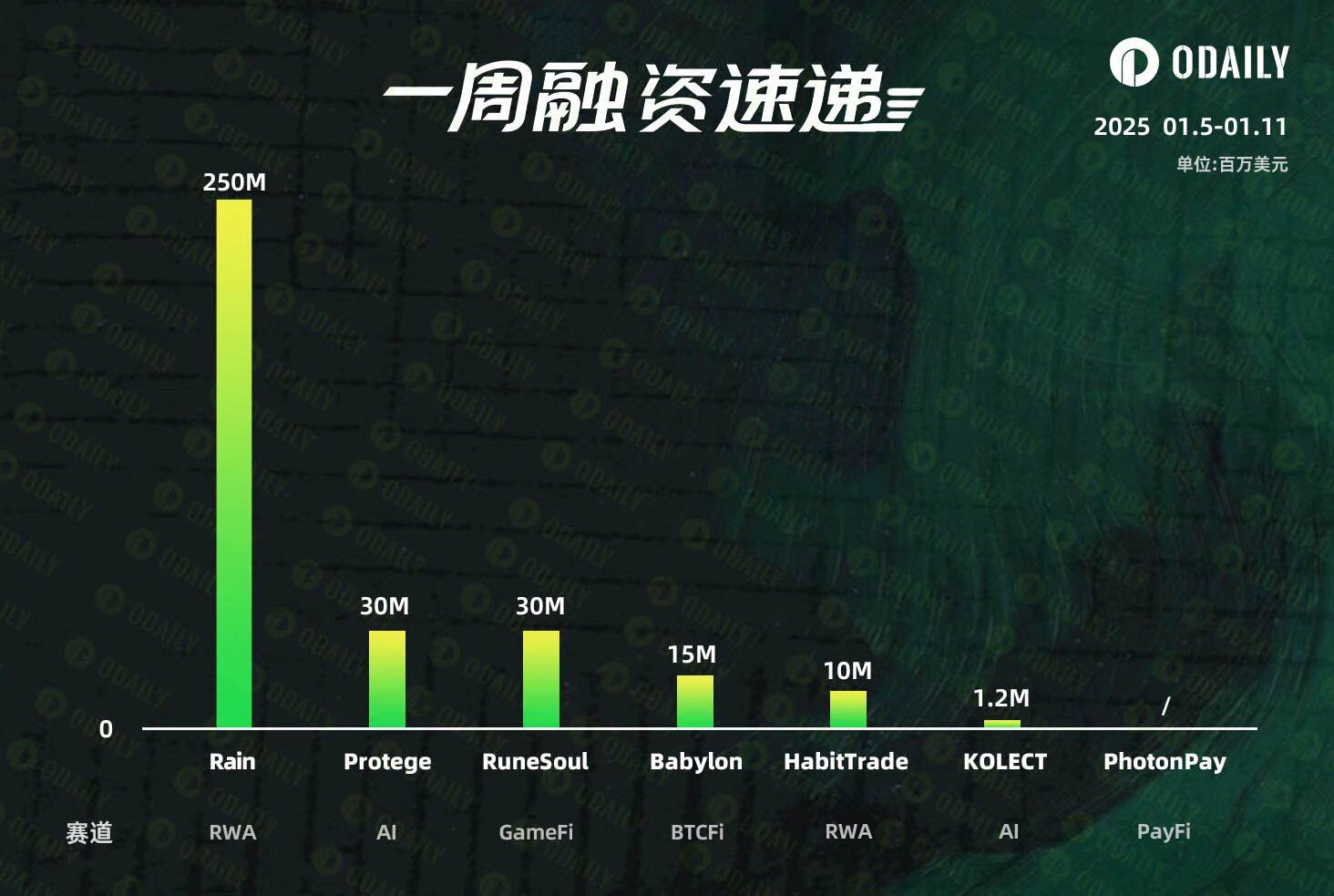 本周单笔融资规模最大的是稳定币公司 Rain 宣布以 19.5 亿美元估值完成 2.5 亿美元融资;其次则是AI 数据交换平台 Protege 宣布完成 3000 万美元 A 轮融资。