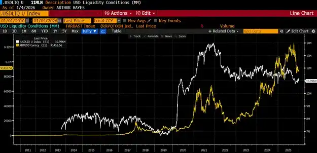 比特币(数字黄金)的上涨,直接源于印钞。这一点可以从我构建的美元流动性条件指数中清楚地看到(Bloomberg 代码:.USDLIQ U Index)。