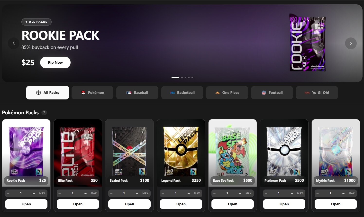 卡包定价区间包括 25 美元、50 美元、80 美元、250 美元和 500 美元,不同价位对应的稀有度与潜在价值各不相同。除宝可梦卡牌外,平台还引入了 One Piece 等其他热门 IP,拓展了收藏品种类与受众基础。