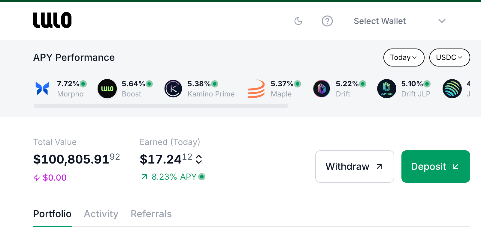 Lulo 是一个基于 Solana 生态的 DeFi 稳定币收益平台,专注于为用户提供“无交易、无噪音”的自动化收益策略。