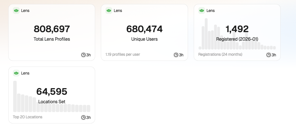 但我也不认为把 Lens 比作烂摊子很过分。据 web3.bio,Lens 账户创建总数达 80.8 万,独立用户数为 68 万,即使不与 Web2 社交平台比,仅与同赛道的 Farcaster 相比,也略糟糕。Farcaster 的账户创建总数达 186.7 万,独立用户 185.8 万,均在 Lens 的两倍以上。在新增用户上,二者表现也有差距,Farcaster 2026 年 1 月新增注册用户 37.3 万,而 Lens 仅 1492 个。