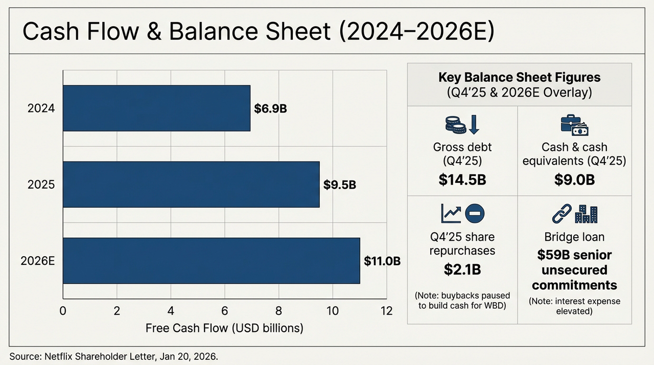 客观而言,WBD 收购案将 Netflix 从一家轻资产的科技公司,瞬间拉回到了传统媒体的重资产泥潭中。为了完成这笔每股 27.75 美元的全现金交易,Netflix 背负了高达 590 亿美元的高级无担保过桥贷款承诺(Senior Unsecured Bridge Loan),这一决策的直接后果,在资产负债表上表现为一场惊心动魄的「压力测试」。