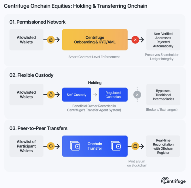 2025 年 12 月 5 日,Centrifuge 发布《Centrifuge Tokenized Equities: A Reference Architecture for Regulated Onchain Equity》,系统化给出合规链上股权的参考实现框架,其核心思路与市场已验证的逻辑一致:由受监管的过户代理(Transfer Agent)统一管理股东名册,实现受限转让流程的透明化,确保链上代币与实体股权法律效力一致。