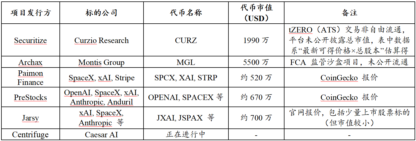 - 市场体量错配:全球独角兽估值超数万亿美元,但股权代币化可自由流转规模仅千万至一两亿美元,资产高度集中于OpenAI、SpaceX等少数头部科技独角兽。