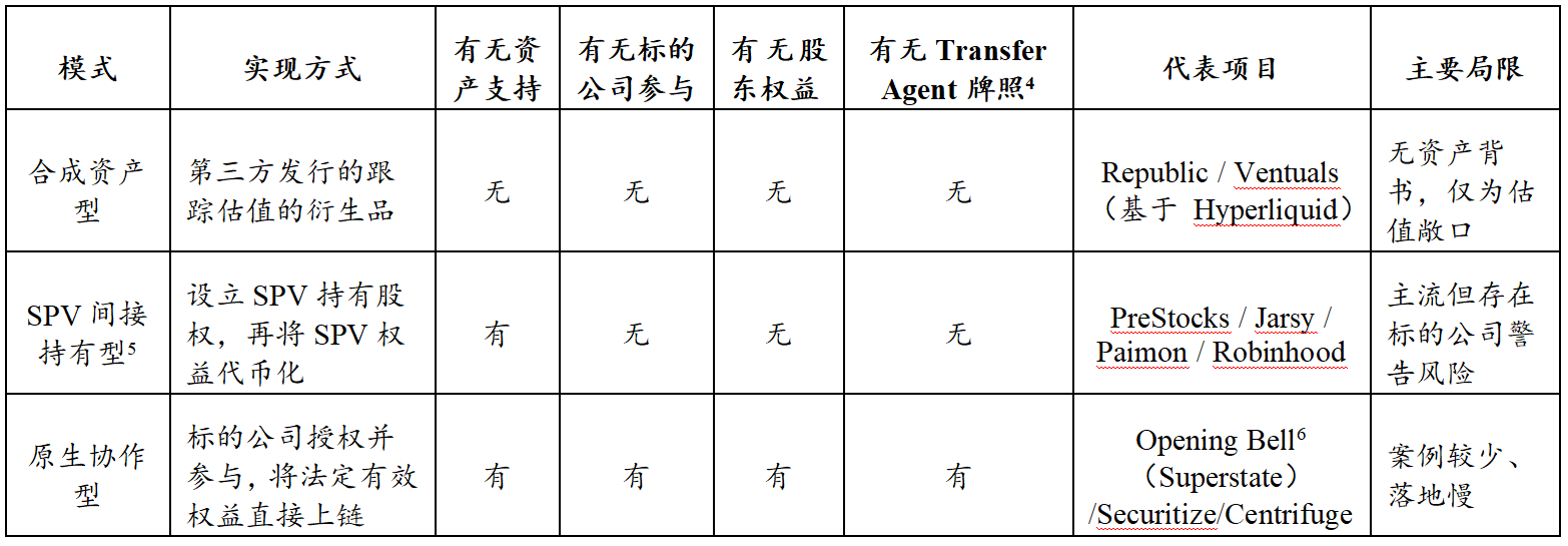 - 三种实现路径分化:合成资产型(如Republic)提供估值敞口;SPV间接持有型(如Jarsy)是当前主流但面临法律合规风险;原生协作型(如Securitize)以过户代理(TA)资质实现真股上链,是合规终局路径。