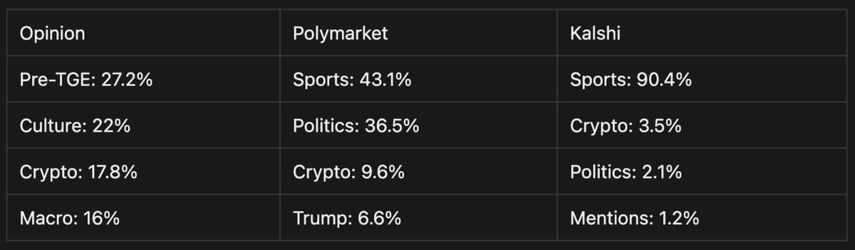 - 不同于美国市场聚焦体育,其他地区的预测市场(如Opinion)正差异化发展,加密货币等原生事件交易占比较高。