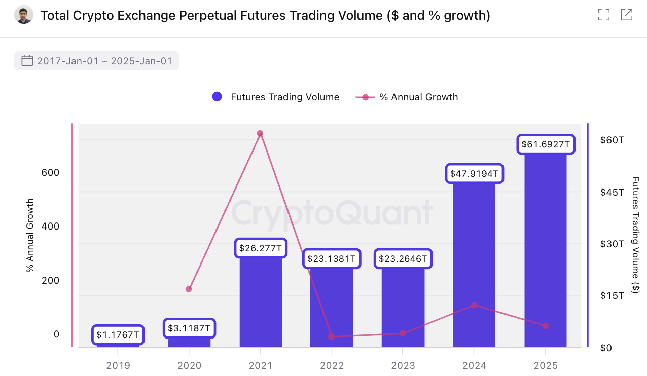 Figure 10.Total Crypto Exchange Perpetual Futures Trading Volume ($ and % growth). Source: https://cryptoquant.com/community/dashboard/695c6e246f89e81772a357eb?e=69603f6a4c7a21121994f822