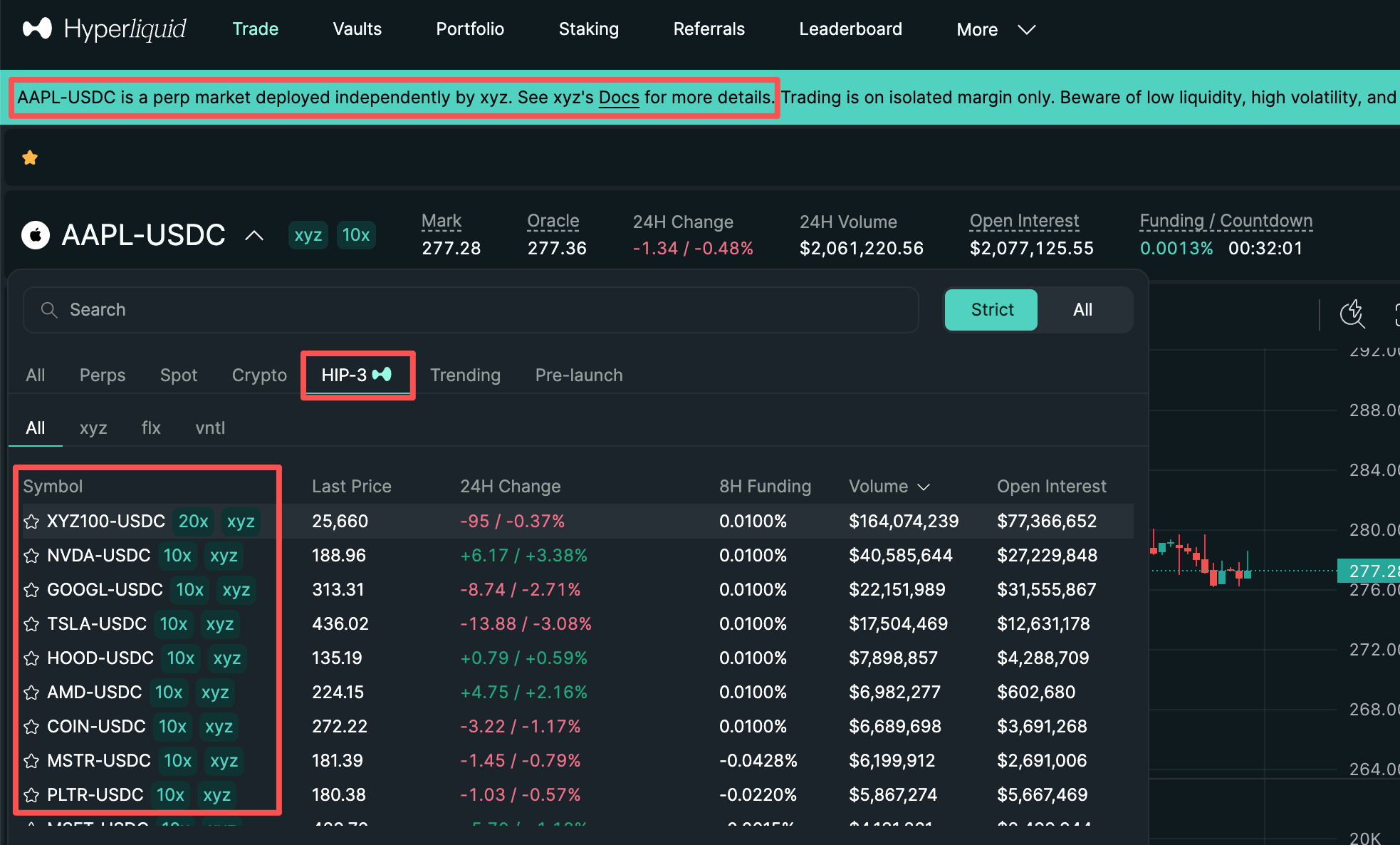 在链上股票永续赛道中,Hyperliquid 是当前扩张速度最快、生态化程度最高的基础设施之一。需要强调的是,Hyperliquid 并非直接以官方合约的形式独立推出股票永续,而是通过 HIP-3(Hyperliquid Improvement Proposal-3)框架,引入第三方 Builder 在其底层交易系统之上部署股票永续产品。