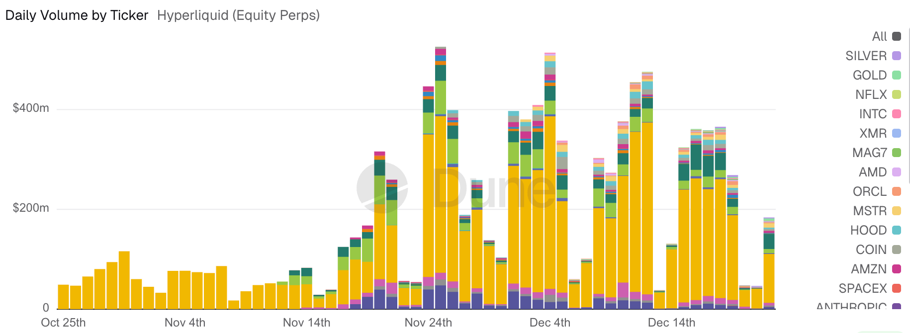 截至 2025 年底,Hyperliquid 平台已支持 20 余支股票永续标的,整体杠杆水平主要集中在 10 倍左右,仅有少数资产支持最高 20 倍杠杆。随着 Trade.xyz 于 2025 年 11 月正式上线,股票永续交易板块开始显现出较为明显的增长动能。根据 Dune 数据,截至 2025 年 12 月 24 日,Hyperliquid 上的股票永续合约单日交易量峰值约为 5.26 亿美元(出现在 2025 年 11 月 25 日)。当日平台整体交易量约为 98.67 亿美元,股票永续交易量占比约为 5.33%。在交易相对低迷的时段,股票永续的单日成交规模仍维持在几千万美元水平,而 Hyperliquid 平台整体交易量则长期稳定在 13 亿美元以上。