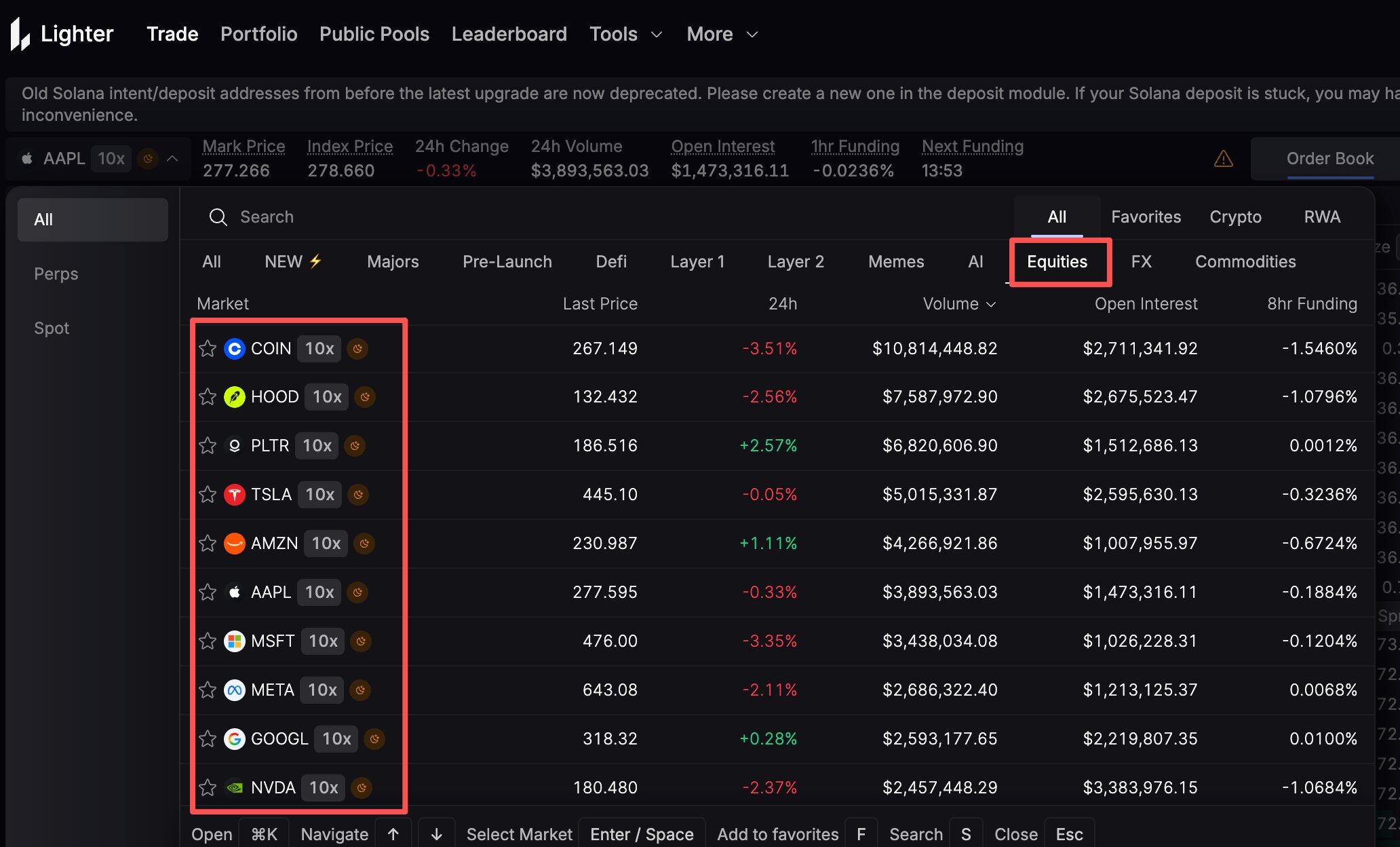 从实际落地成熟度来看,股票永续合约并非停留在概念层面。以 Aster、Hyperliquid(Trade.xyz)、Lighter、ApeX 等平台为代表,这些头部 Perp DEX 已率先上线 AAPL、TSLA、NVDA 等主流美股标的,并在实际交易中验证了该类产品对用户活跃度与交易量的拉动作用。相关案例表明,股票永续并非单纯的叙事创新,而是一类已经具备规模化交易能力、能够在现实市场中跑通的衍生品形态。