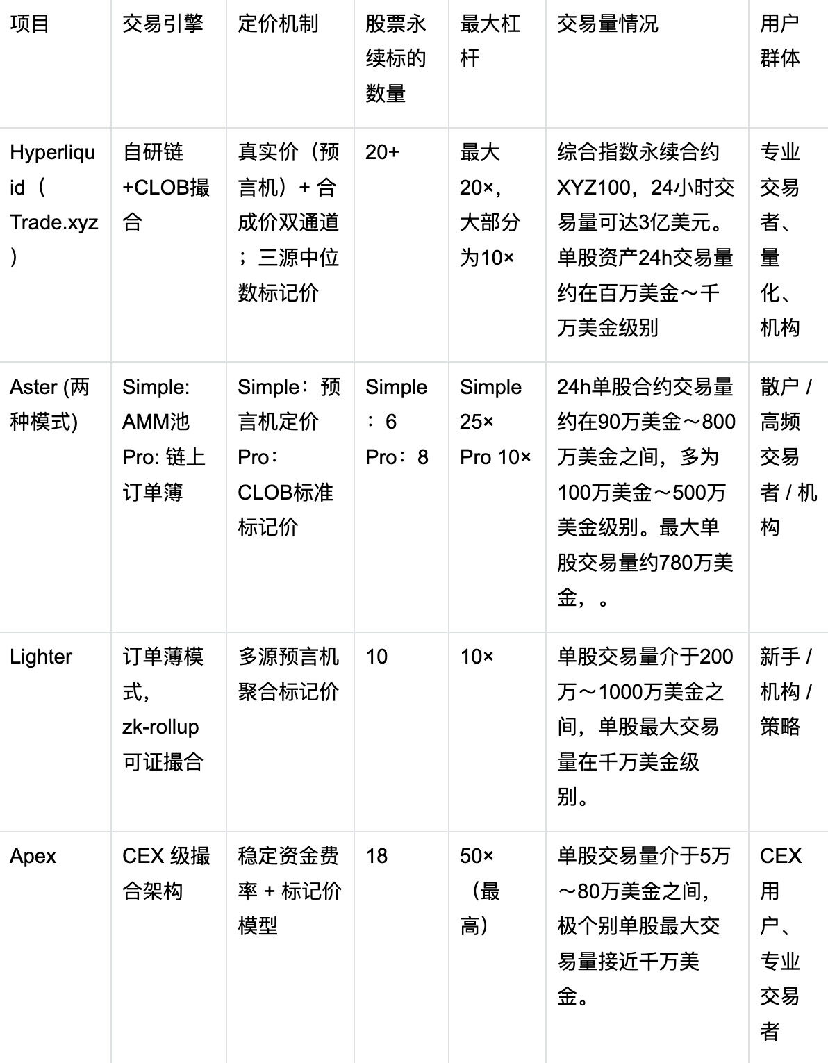 同时,股票永续正在逐渐成为头部 Perp DEX 的标配功能。目前 Hyperliquid、Aster、Lighter、Apex 都已上线股票永续产品,其中 Hyperliquid 的成交量与深度最为领先,已经形成显著的流动性优势。在多个平台同时投入资源、持续拉升流动性的背景下,股票永续可能从单一平台的探索走向行业性的普及阶段。股票永续的出现正在补齐 Perp DEX 的“全资产矩阵”,并逐步被视为面向更广泛用户群体的核心配置。