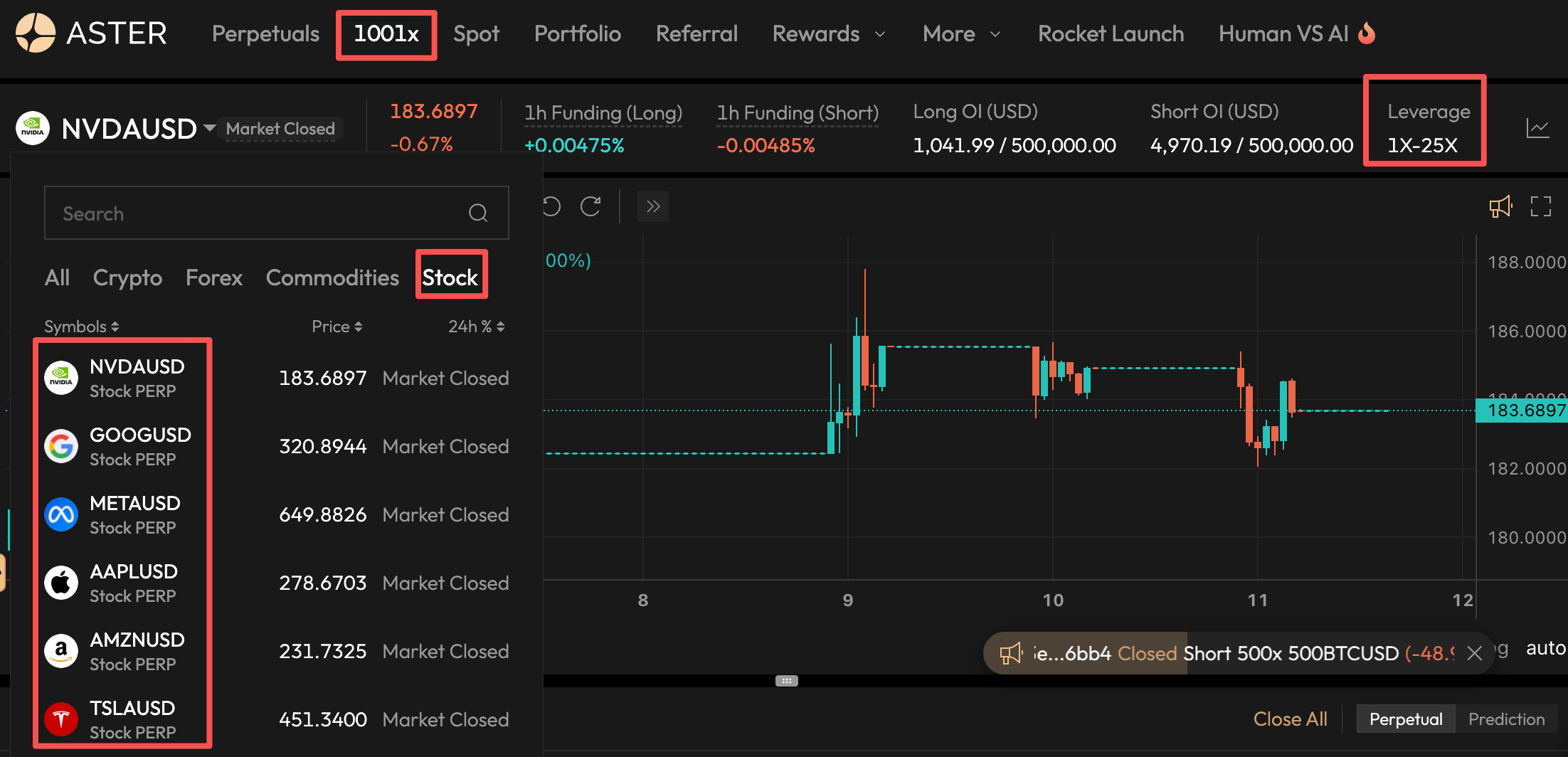 在 Simple Mode 下,Aster 的目标是让交易像点按按钮一样简单,一键开仓、一键平仓,完全链上、无须挂单。这里流动性来源于它自己的流动性池 (ALP, Aster Liquidity Pool),也就是说用户并不是在和另一个挂单对手交易,而是直接与资金池互动。因为没有订单簿、没有复杂挂单结构,这种设计本质上类似 AMM + oracle 定价 + 池子做市,交易几乎没有滑点,速度极快。对很多希望快速进出、进行短线、或者只是想体验杠杆交易的用户来说,这种极简操作非常友好。Aster 为了满足这类需求,甚至在人们最习惯的加密资产交易对 (如 BTC/USDT 等) 提供高达 1001× 杠杆的 “Degen 模式”。但是针对股票永续,该模式下的最大杠杆仅为 25 倍。