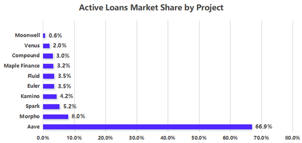 从活跃贷款占比来看,Aave 独占约 70% 的市场份额,处于绝对龙头地位;其次是 Morpho(约 8%) 和 Spark(约 5%),两者合计接近一成;Kamino、Euler、Fluid、Maple Finance、Compound 各自占比在 2%–4% 区间;而 Venus、Moonwell 等则份额不足 2%,整体体量较小。整体格局呈现头部高度集中、腰部分散的特征,Aave 几乎决定了市场走势。