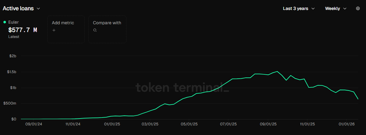 截止至目前,Euler Finance 总 TVL 约为 6.3 亿美元。从链上分布来看,以太坊主网仍然是 Euler 的核心部署网络,约占整体 TVL 的三分之一。2024 年大部分时间内,Euler 借贷规模仍处于较低水平,随后在恢复进程推进下持续放量,并于 2025 年中后期一度攀升至约 14 亿美元的阶段性高点。此后,受市场波动影响,活跃贷款规模自高位有所回落,截至目前约为 5.78 亿美元。整体来看,尽管较高点出现回调,但 Euler 当前的借贷规模仍明显高于早期恢复阶段,表明其借贷需求与协议稳定性已得到部分修复。