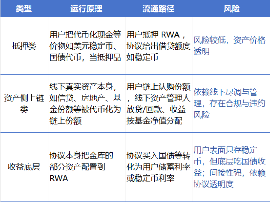 本报告按照当前 RWA 接入链上借贷的方式,将相关项目划分为三类:第一类为抵押型,即将代币化的美元现金等价物或国债类资产作为可质押物,以超额抵押的形式获取稳定币;第二类为资产侧上链,通过将线下的信贷、房地产或基金份额标准化为链上池份额或金库份额,投资人按基金净值与分配记录获取收益;第三类为收益底层,即协议将部分金库资产配置到 RWA,将利息注入储蓄利率与稳定币利率中,这三者的具体差异如下表所示: