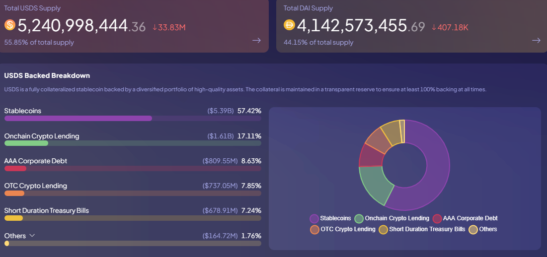 目前,Sky 当前的稳定币总供应量约为 93.84 亿美元,其中 USDS 占比 55.85%(约 52.41 亿美元),DAI 占比 44.15%(约 41.43 亿美元)。USDS 的抵押资产组合呈现多元化分布,以稳定币类资产占比最高(57.42%,约 53 亿美元),其次是链上加密借贷资产(17.11%,约 16.1 亿美元),其他资产合计占 25.48%。这种资产配置结构说明 Sky 并非依赖单一资产,而是结合稳定币、链上信贷与传统低风险资产的多样性组合,在安全性与流动性之间实现平衡。