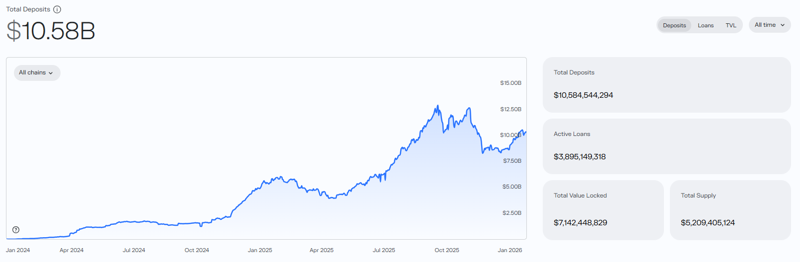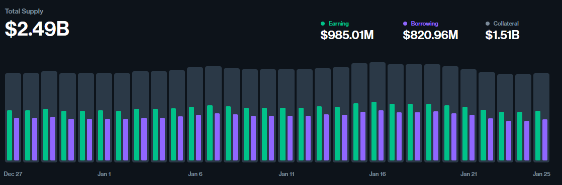 截止至目前,Compound 的活跃借款总额约为 8.6 亿美元。从走势看,Compound 在 2024 年中后期经历了一轮明显回落后,于 2024 年末至 2025 年初重新走强。过去一年中,其借贷规模自 2024 年中期约 9 亿美元起步,在 2025 年第三季度一度攀升至约 11.5 亿美元的阶段性高点,随后受加密市场波动及头部借贷协议竞争加剧影响,活跃借款规模回落至 8 亿美元附近。2025 年末,借款总额虽较高点有所回调,但整体保持在 8 亿美元区间内震荡,显示 Compound 借贷需求具备较强韧性。