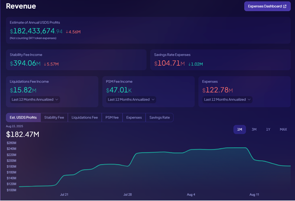Sky 在更名之后,其活跃贷款规模主要由 DAI 和 USDS 稳定币的流通量与抵押型借贷需求构成,但和 Aave、Compound 这类完全依赖借贷市场匹配供需的模式不同,Sky 的贷款本质上是协议发行稳定币与市场抵押借入的结合。对于 Sky 而言,稳定币的规模就是整体协议的借贷规模。