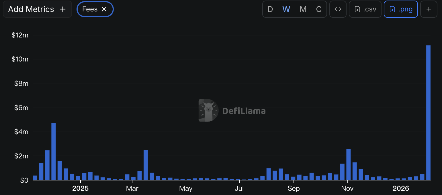 与此同时,受益于 Moltbook 的 AI Agent 发币热潮,相关平台的用户活跃度和流量随之暴涨。比如,Base 上的发射器 Clanker 协议费用在近一周超过 1100 万美元,创历史新高,且代币创建数也接近历史峰值。