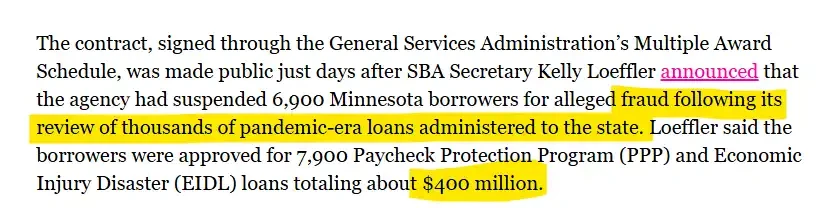 在排查疫情期间的贷款项目时,SBA 发现明尼苏达州存在大规模违规行为:涉及 6,900 名借款人、约 7,900 笔 PPP 与 EIDL 贷款,总金额约 4 亿美元。