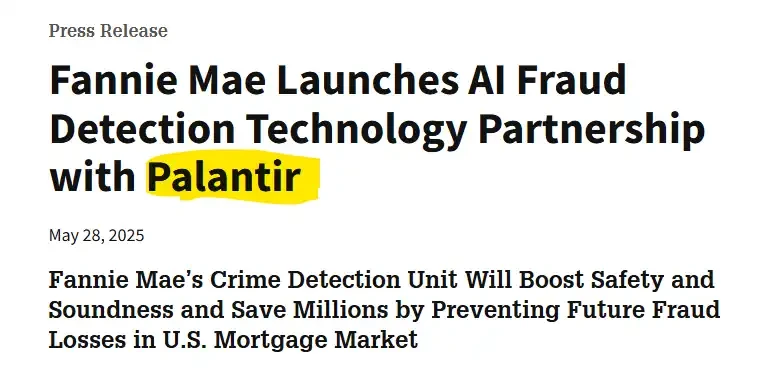 房利美(Fannie Mae)已正式与 Palantir 建立 AI 反欺诈技术合作,将 Palantir 的 AI 能力引入其犯罪检测体系,用于在数以百万计的数据集中识别过去难以发现的欺诈模式,以减少美国按揭市场的未来损失。