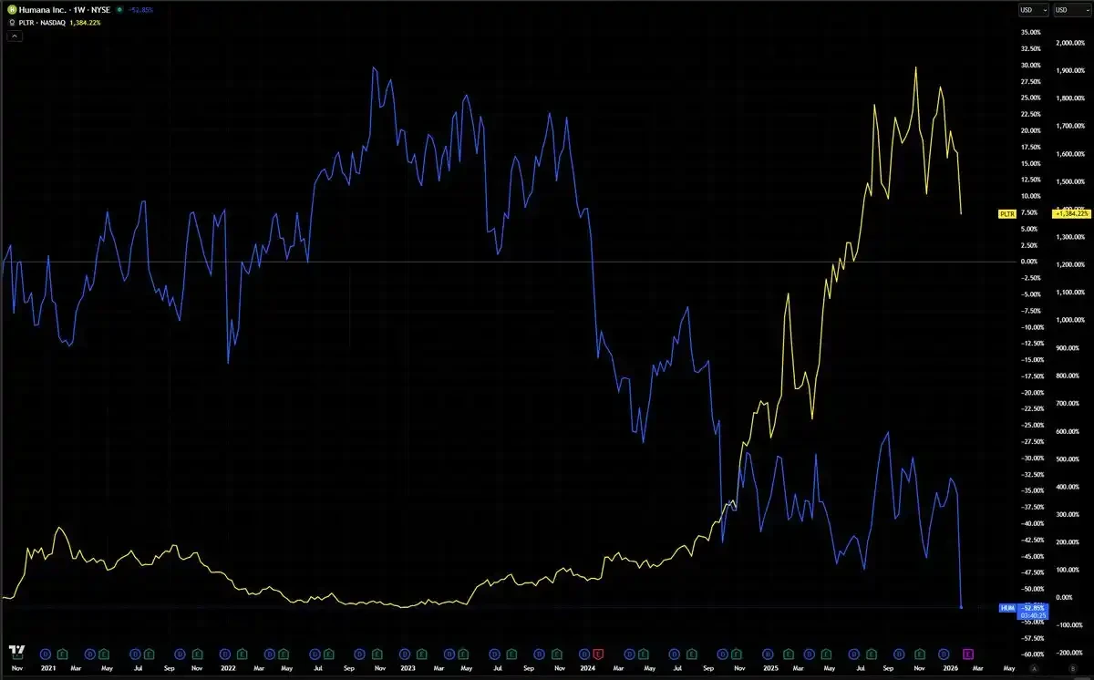 我觉得一个现象非常有意思:Humana 这家公司拥有规模超过 1000 亿美元的政府合同,是政府最大的承包商之一,而它的股价却在 Palantir 持续上涨的同时不断走弱。