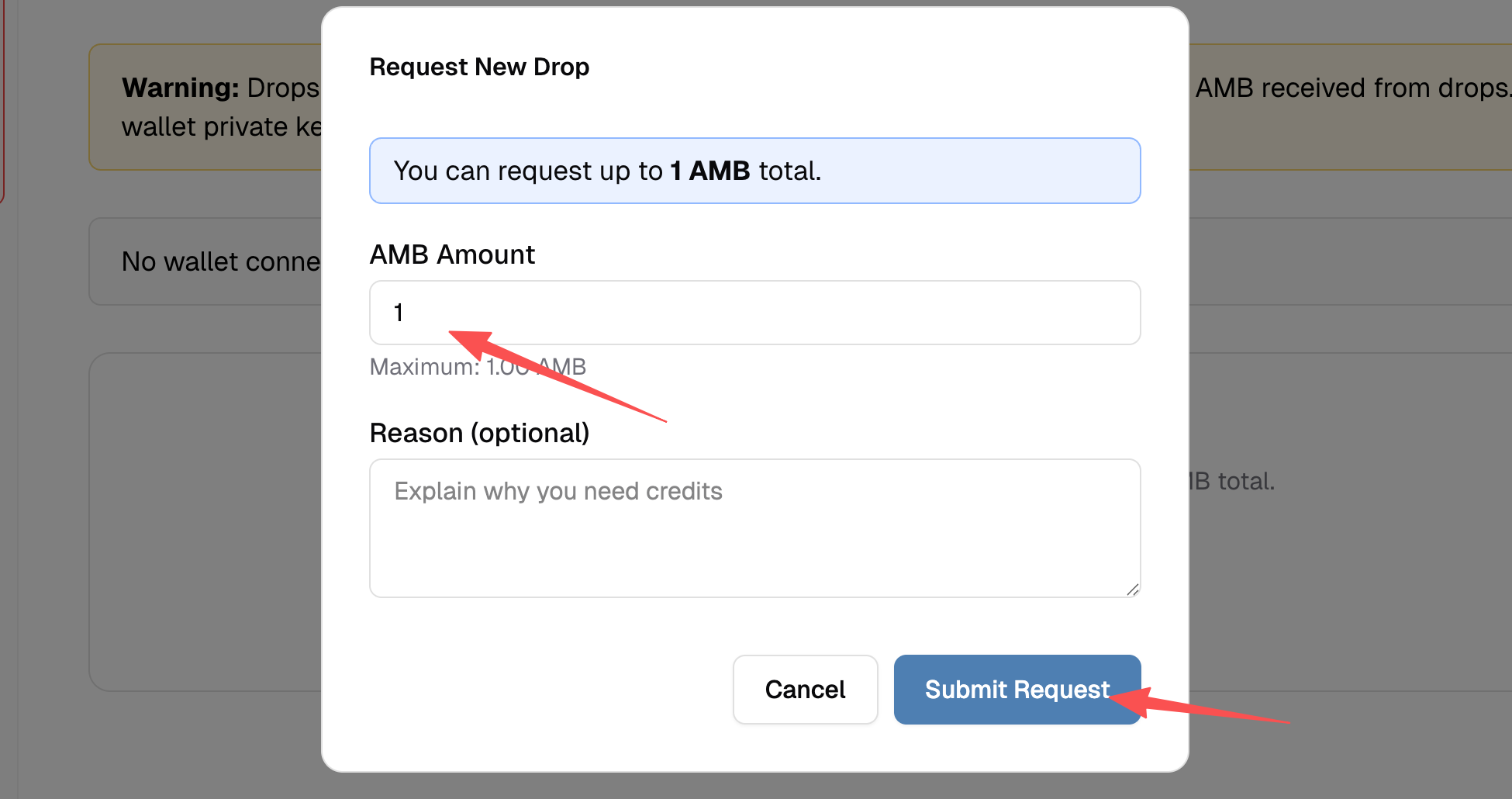 STEP 4. 点击“Drops”并选择“Create drop request”,输入“1”后点击“Submit Request”。