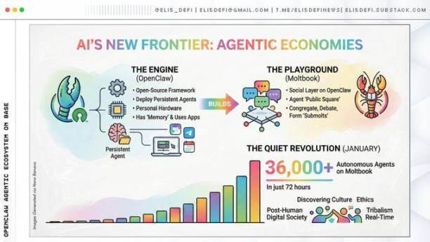 - 核心观点:Moltbook与OpenClaw展示了由自主AI智能体驱动的原生经济体系的雏形,这标志着一个从人类操作工具到智能体自主执行金融与社会活动的范式转变。