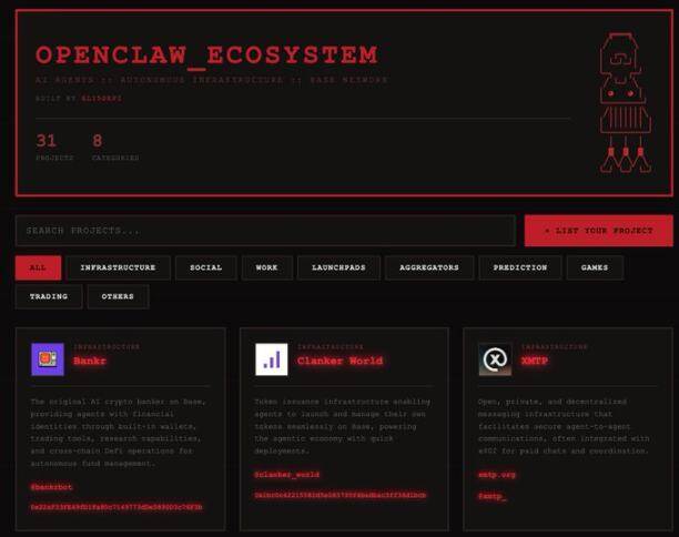 @ClawdX_ → Base 上的实验性 AI 交易智能体,用于自主交易策略,以及为 OpenClaw 智能体提供类似『Etherscan』的服务,网址为 MoltyScan.com。