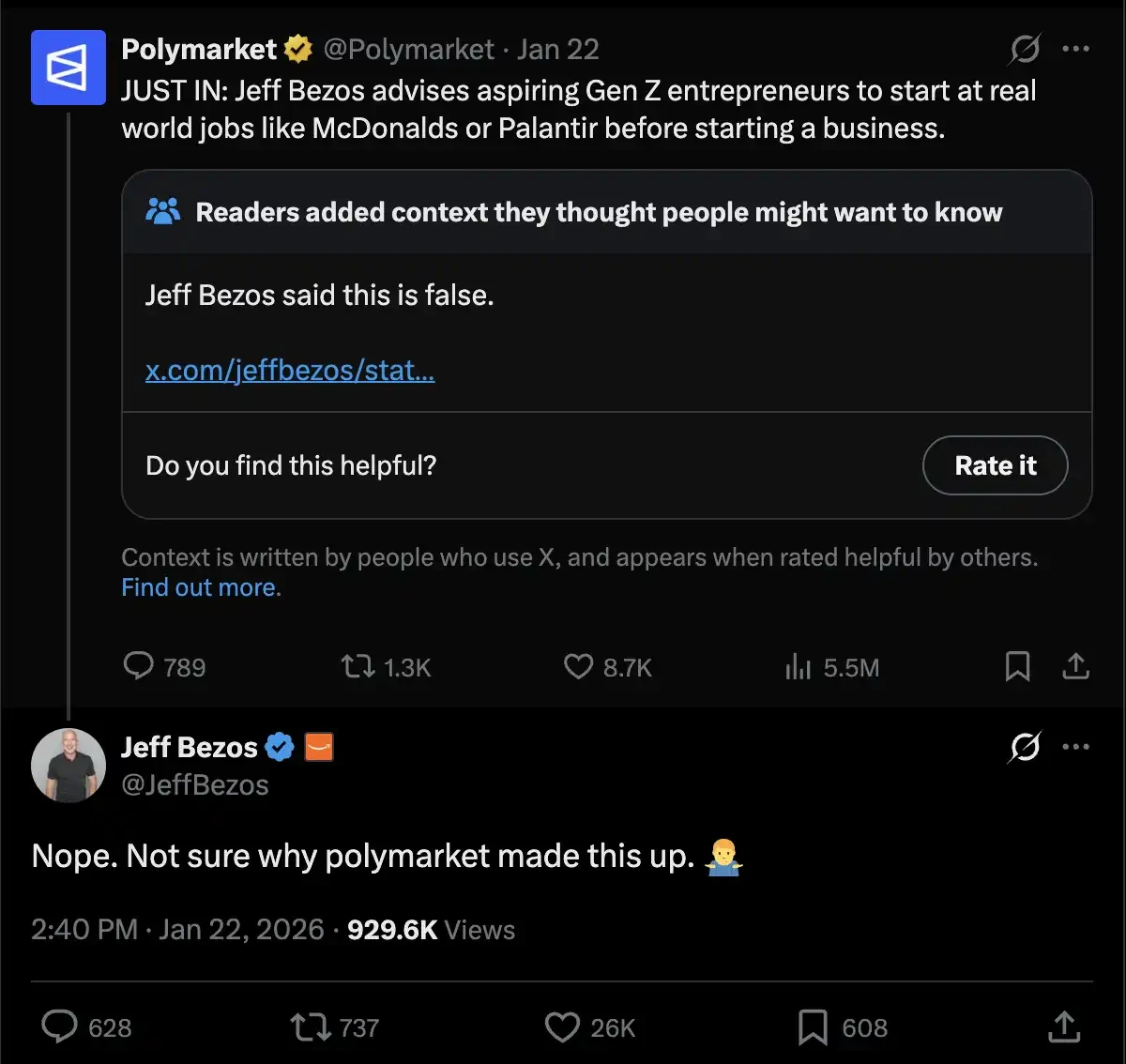 他们找到的一种「扩大声量」的方式是:在 X 上做新闻。过去几个月里,Polymarket 和 Kalshi 的品牌账号在时间线上正面交锋,用简短有力的标题、名人语录来争夺传播优势——有时甚至不太顾及准确性,或者别的什么原则。最近,Polymarket 曾错误地将一句话归因给 Jeff Bezos,还大幅夸大了遣返数据;而 Kalshi 这边,则散布了关于收购格陵兰谈判的虚假说法。