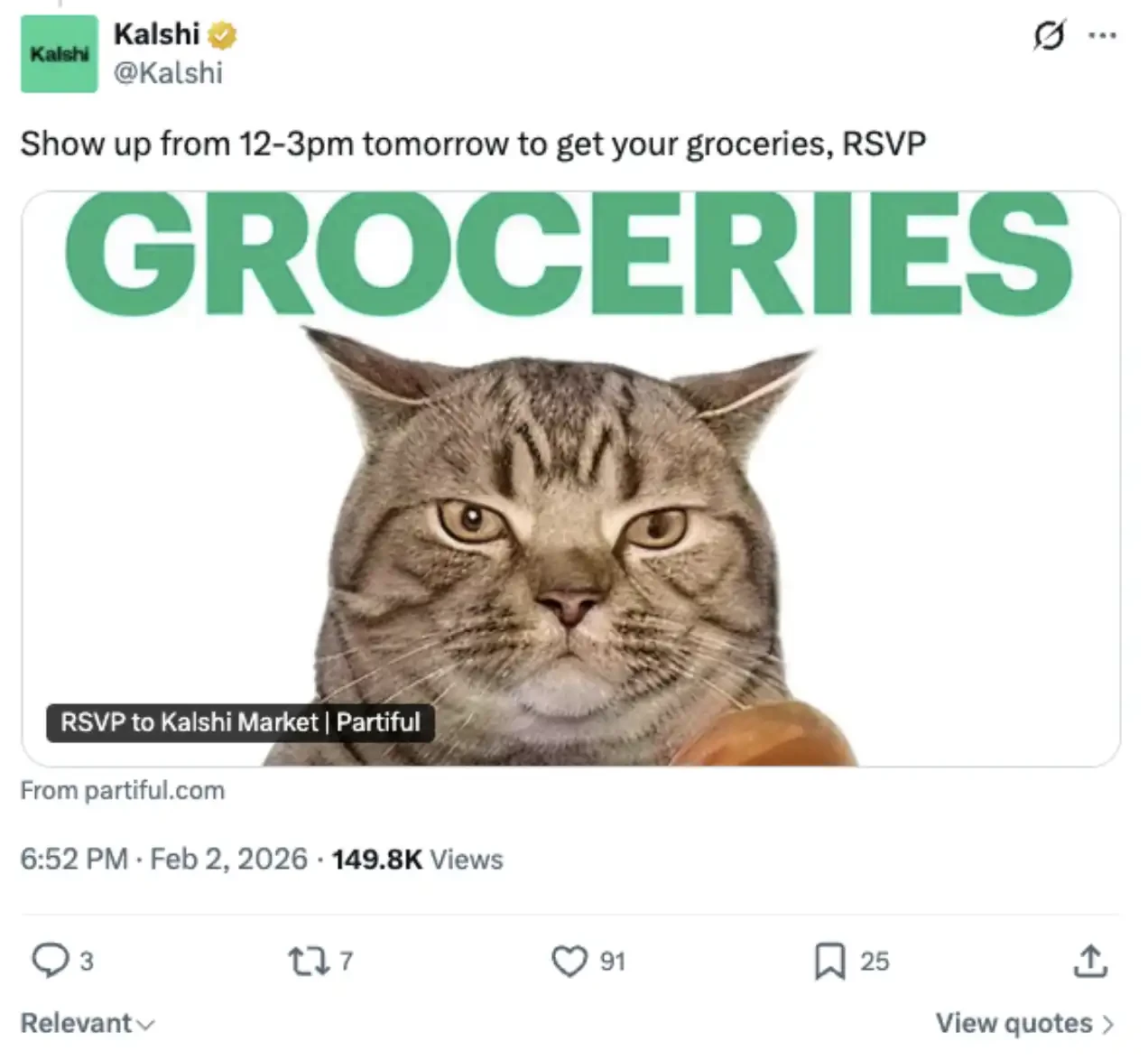 而它的竞争对手、另一家预测市场 Kalshi 也不甘示弱,抢先推出了自己的「杂货主题」营销行动:在第三大道的 Westside Market,限时一天,向所有人发放 50 美元的通用杂货补贴。