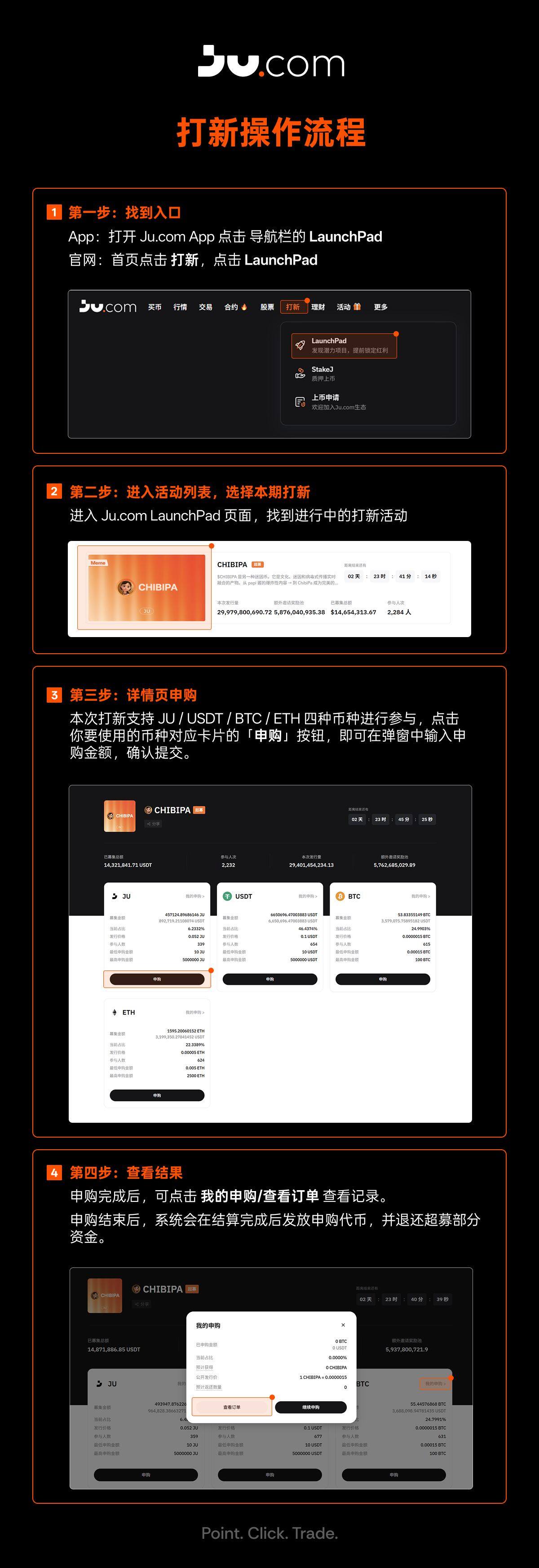 - 准备认购资产:每期支持的认购币种/入口以当期页面展示为准(示例:JU / USDT / BTC / ETH 等)。