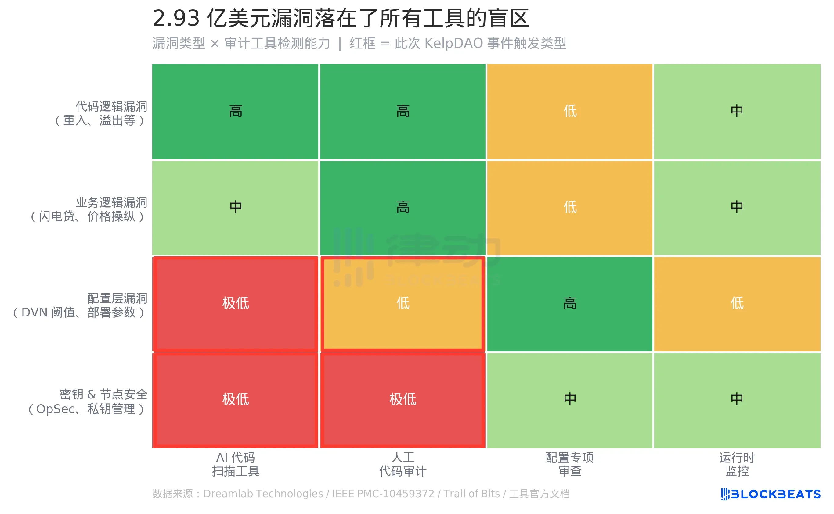 同样在红色区域里的是密钥和节点安全。@0xQuit 的描述里提到 DVN 节点「被攻破」,这属于运营安全(OpSec)范畴,超出任何静态分析工具的检测边界。无论是哪家一线审计机构还是 AI 扫描工具,都没有能力预判一个节点运营商的私钥是否会被泄露。