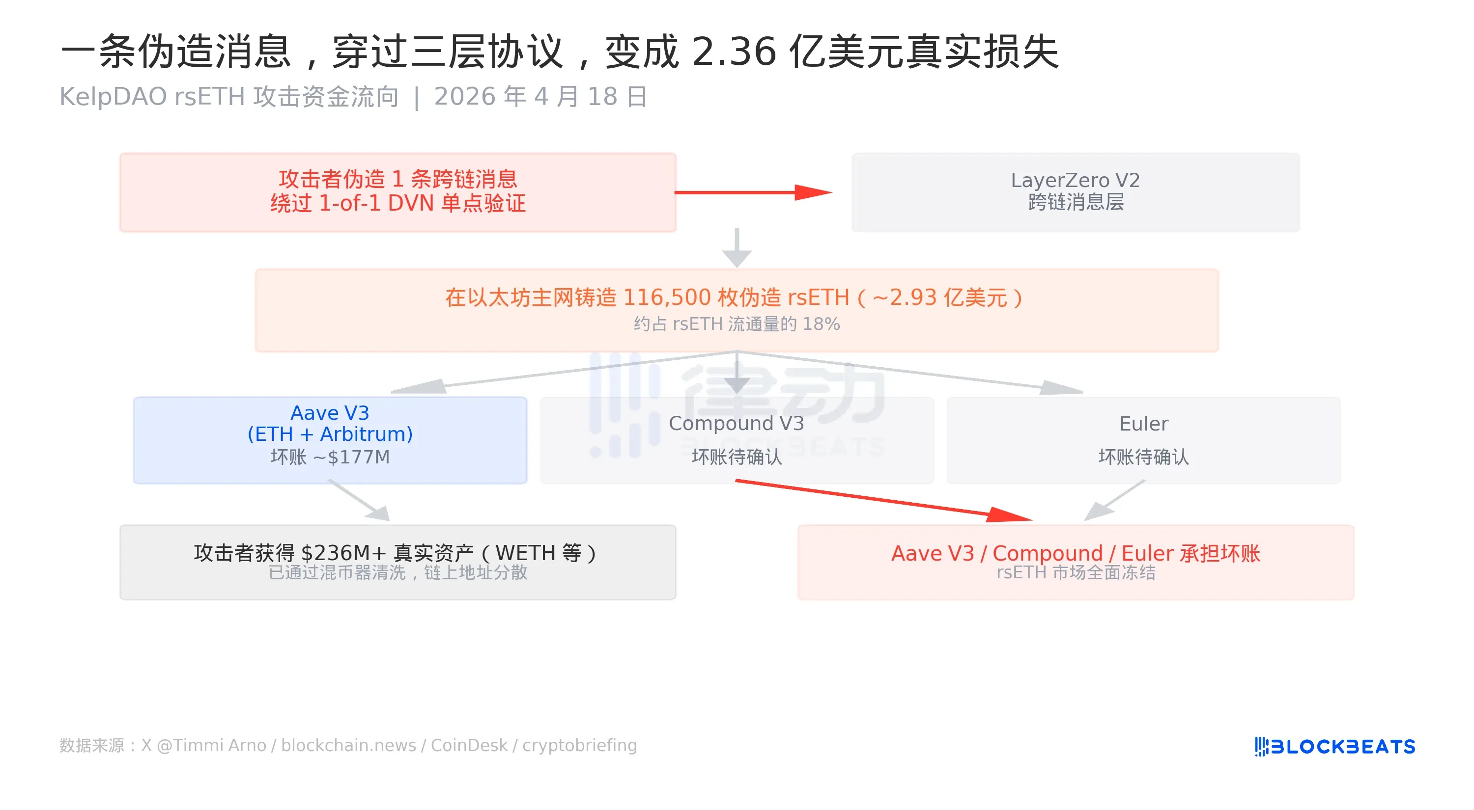 2026 年 4 月 18 日,Kelp DAO 的流动性再质押协议在几个小时内被攻击者从跨链桥里抽走了 116,500 枚 rsETH,按当时价格约合 2.93 亿美元。整个流程高效得有点反常,从伪造跨链消息到把赃款分散在 Aave V3、Compound V3 和 Euler 三个借贷协议里借出真实资产,攻击者在当天就带着 2.36 亿美元的 WETH 撤场了。Aave、SparkLend、Fluid 随即全面冻结 rsETH 市场。