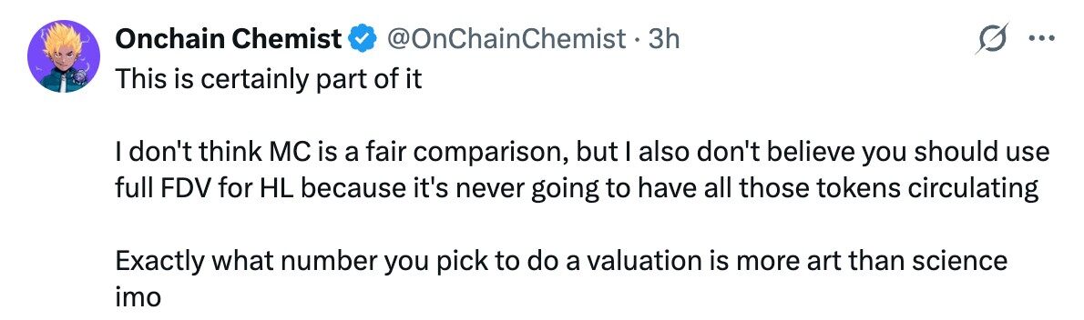Blockworks 的另一名研究员对此提出了一些质疑,Hyperliquid 的代币 FDV 达到了 390 亿美元,如果用这个数字去计算似乎一切就很合理。