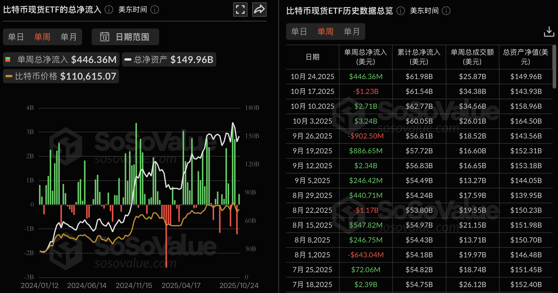 Odaily星球日報訊根據SoSoValue 數據,上週交易日(美國東部時間10 月20 日至10 月24 日)比特幣現貨ETF 單週淨流入4.46 億美元。