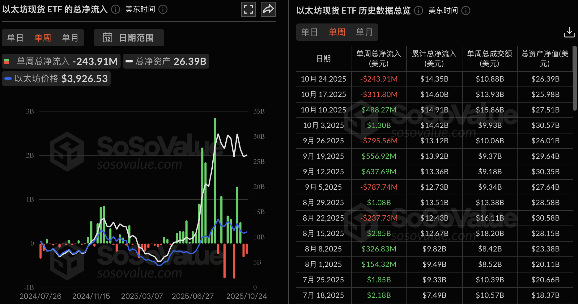Odaily星球日報訊根據SoSoValue 數據,上週交易日(美東時間10 月20 日至10 月24 日)以太坊現貨ETF 單週淨流出2.44 億美元,九隻ETF 無一淨流入。