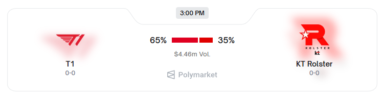 Polymarket上預測今日「英雄聯盟T1 vs KT」總決賽成交量超440萬美元
