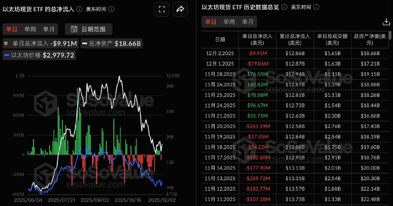 Odaily星球日報訊根據SoSoValue 數據,昨日(美國東部時間12 月2 日)以太坊現貨ETF 總淨流出991.21 萬美元。