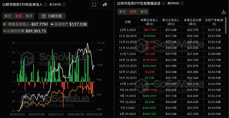 Odaily星球日報訊根據SoSoValue 數據,上週交易日(美東時間12 月1 日至12 月5 日)比特幣現貨ETF 單週淨流出8,777 萬美元。