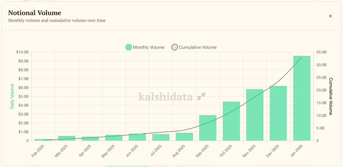 Odaily訊 KalshiData 在 X 平台發文表示,Kalshi 在 1 月結束時名義交易額超過 95 億美元,創下該平台單月成交量歷史新高。12 月交易額約為 61.5 億美元,1 月環比增長約 55%。按目前增長速度計算,Kalshi 年度交易額有望突破 1000 億美元。