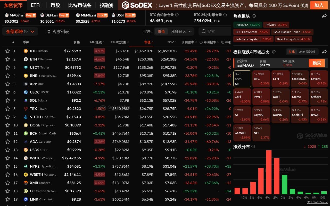 Odaily訊 根據 SoSoValue 數據,加密市場板塊全線下挫,24 小時跌幅普遍約達 2%至 6%。CeFi 板塊領跌 6.05%,其中,Binance Coin(BNB)下跌 7.90%,NEXO(NEXO)下跌 8.11%。與此同時,Bitcoin(BTC)下跌 4.97%,盤中跌破 7.2 萬美元,Ethereum(ETH)下跌 4.66%,一度跌破 2100 美元。