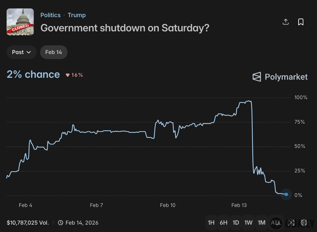 Odaily星球日報訊 預測市場平台 Polymarket 顯示,截至 2 月 14 日,「美國政府本週六停擺」合約機率已降至 2%,較此前高位明顯回落。該合約累計成交量約 1078 萬美元。此前市場一度計入較高停擺風險,但隨著談判進展,預期迅速修正。