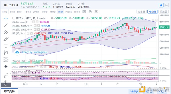 日線級別的圖上看,走勢形成連陽之勢,區間在不斷上移,且目前各均線也是呈上之勢,下方支撐關注49600一線,日內回調不跌破此區域,短時間日內上行趨勢不會改變。當前走勢若是再度突破企穩,那麼上方壓制將上移至55000位置附近,長蘇建議各位幣友提前做好準備。