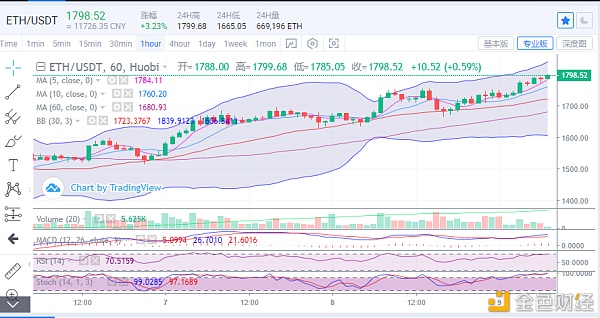 以太坊昨日行情衝高回調,價格上行受阻於17500一線,行情維持震盪上行。到今日價格是破位上漲,突破企穩1750位置後,如期試探1800一線。目前價格在1780位置附近運行。後續若能將1800一線壓制突破,上方空間將會被打開,行情有望進一步上行試探1850附近。