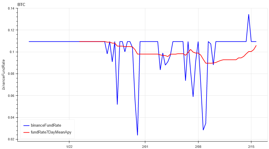 藍色線為幣安上BTC 的資金費率,紅色線為其7 日平均